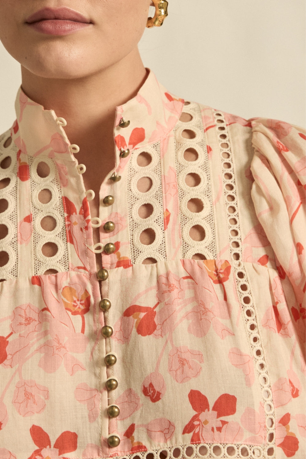 ornate detailing and a relaxed silhouette define the impel dress. with circular lace trims and